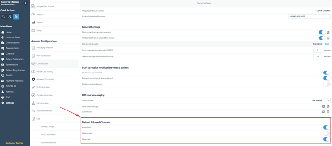 00:39: Allow SMS when this setting is turned on, the system is able to send text messages to the patient.